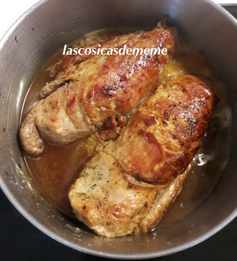 Ponemos los solomillos en la misma cazuela y los doramos por todos lados, no mucho...añadimos el vino y la miel y un poco de caldo para que tengamos salsa suficiente para napar...