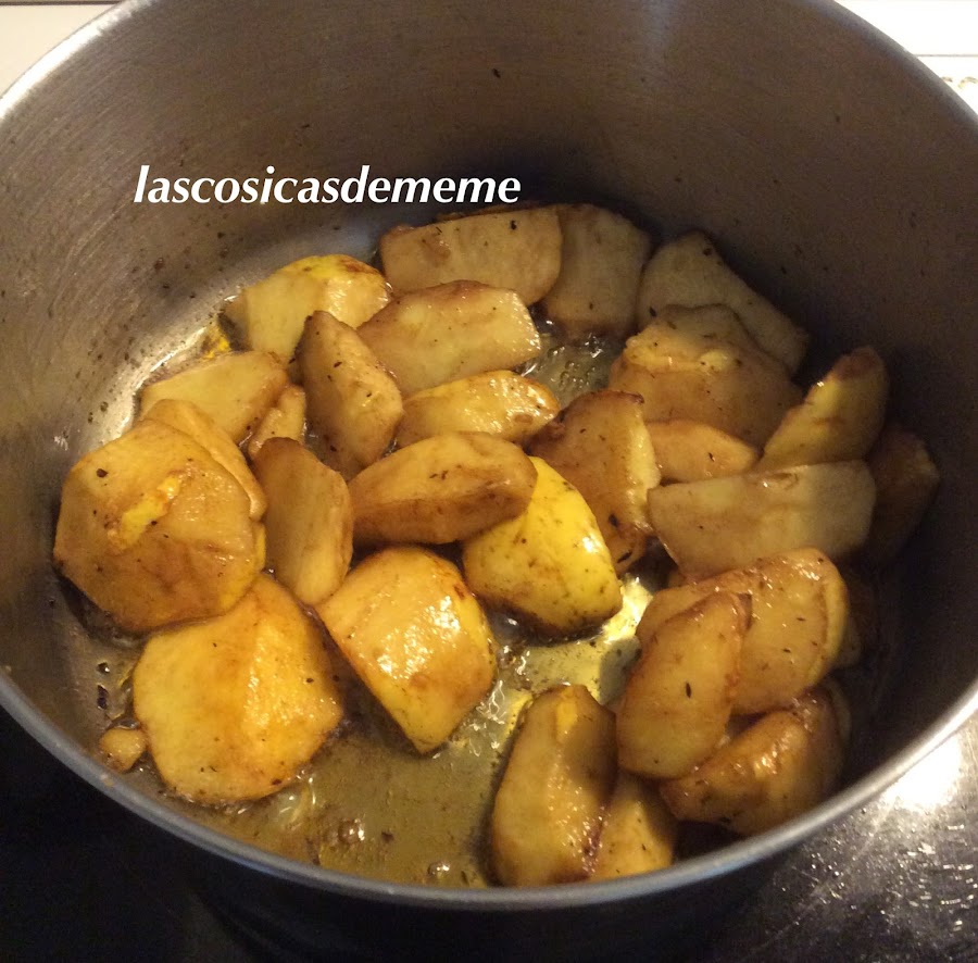 En una cazuela ponemos el aceite y la mantequilla, rehogamos las manzanas, cuando veamos qué se han dorado y están blandas, las sacamos a un plato. Reservamos.