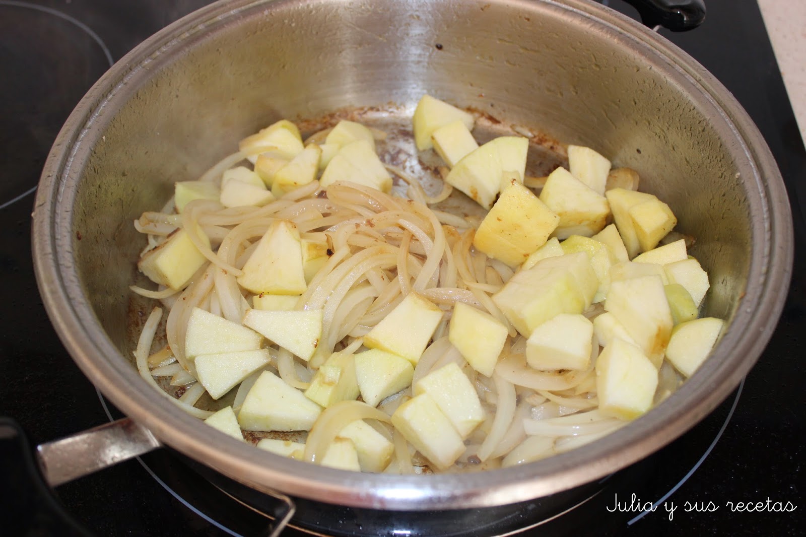 cuando está sofrita añadimos las manzanas pelada y troceadas en cuadrados.
