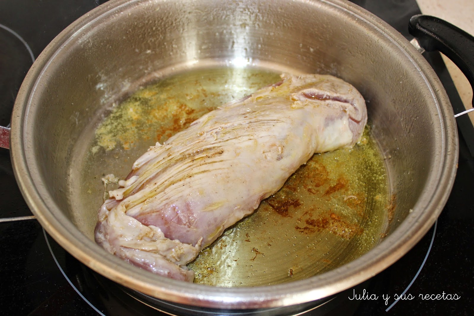 En una cazuela ponemos el aceite y sofreímos el solomillo por por todos lados para sellarlo, lo sacamos y reservamos.