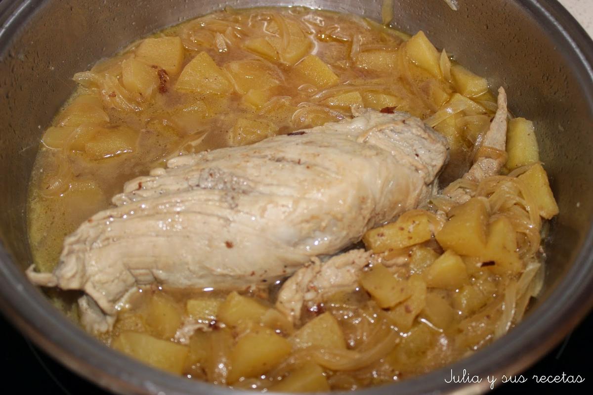 Lo dejamos cocer tapado a fuego medio durante 20 minutos, le damos vueltas al solomillo para que se haga por todos lados. Lo servimos en rodajas con la cebolla y la manzana como guarnición.