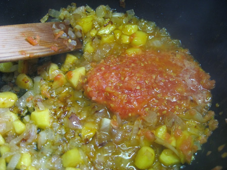 3º " En la cazuela colocamos la cebolla, las manzanas y añadimos los tres tomates rallados, (sin piel). Dejamos que se haga el tomate.