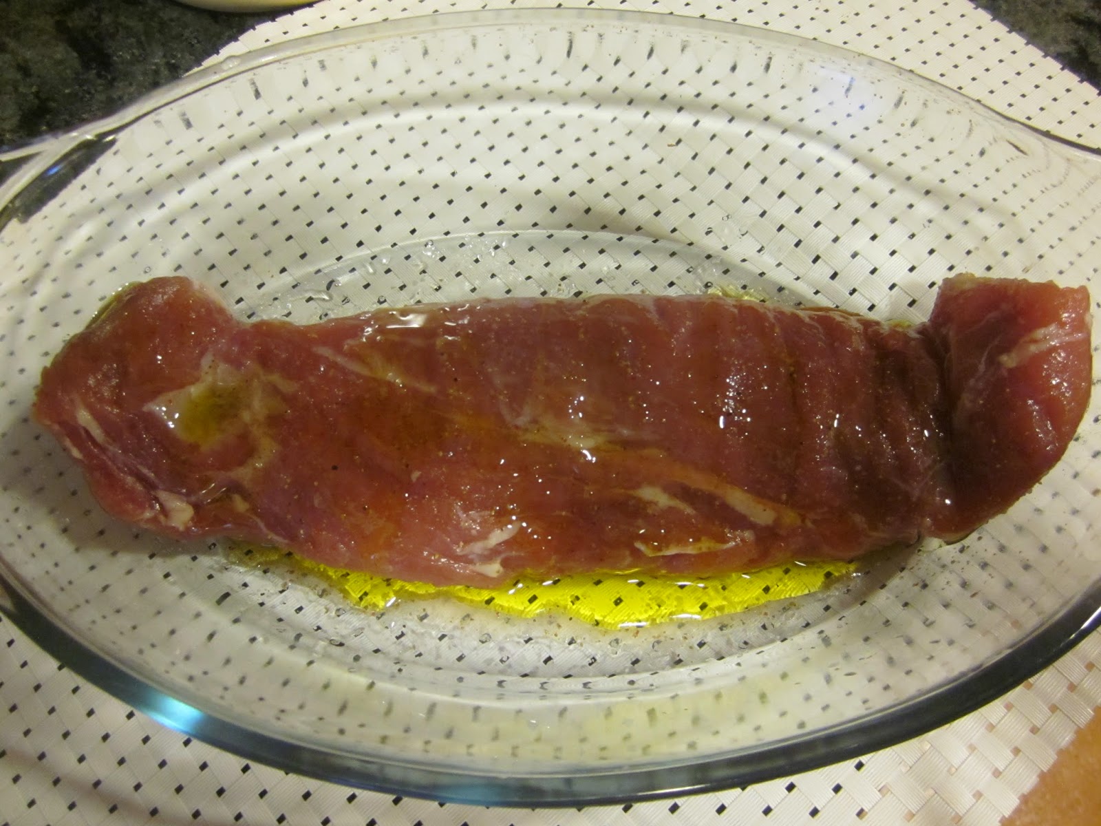 Limpiamos el solomillo y salpimentamos. Lo ponemos en una fuente de horno con un chorrito de aceite.