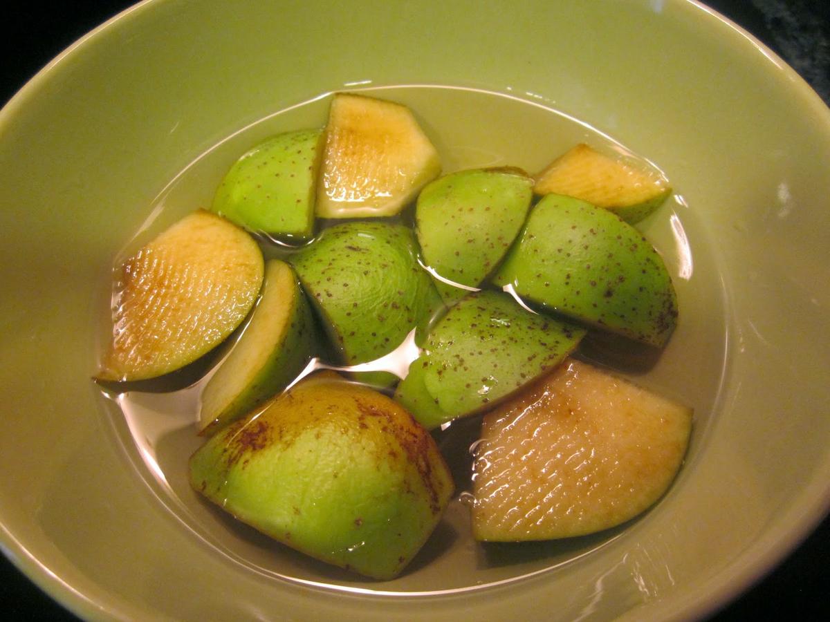 Cortamos las manzanas con la piel y la sumergimos en el vino, reservamos.