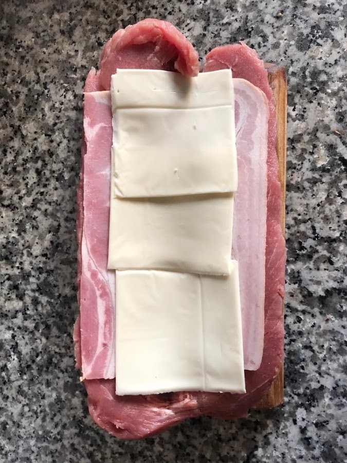 Rellenamos el solomillo con el bacon, y el queso. Lo cerramos y atamos con hilo para cocinar.
