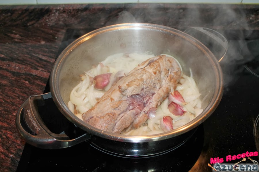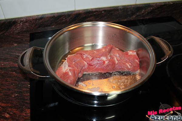 Cuando este caliente añadiremos la manteca de cerdo, cuando este derretida pondremos el solomillo de cerdo.