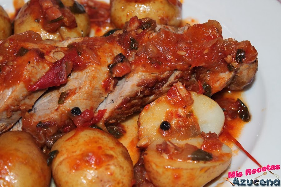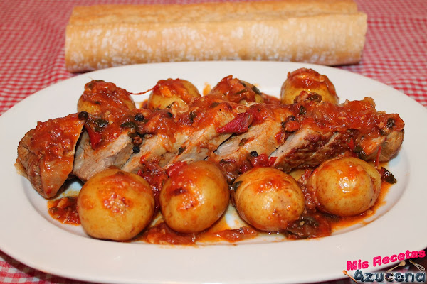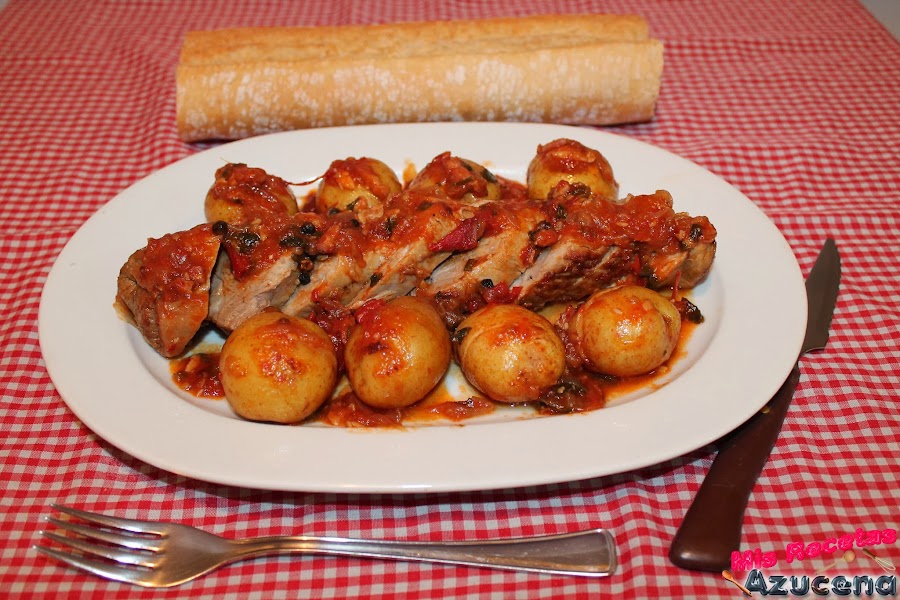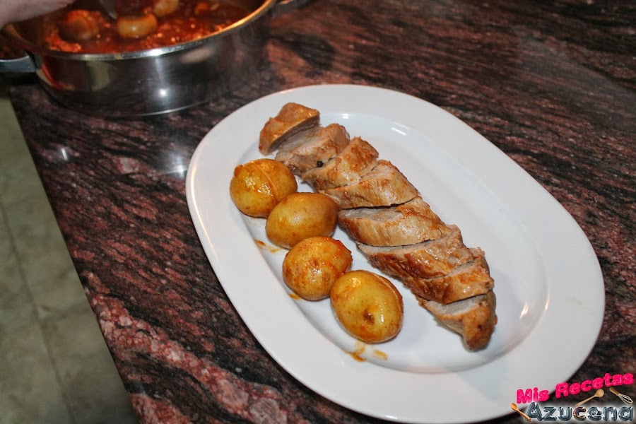 A la hora de presentar el solomillo lo cortaremos en medallones, lo pondremos en el centro de la bandeja, por los lados pondremos las patatas y la salsa que cada en la olla la pondremos por encima de la carne y las patatas.