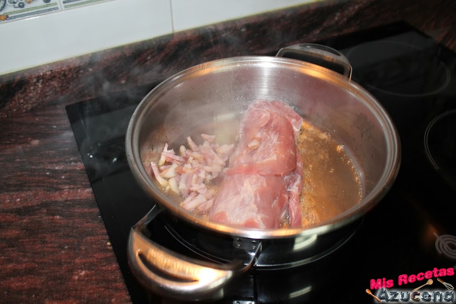 Mientras se dore el lomo picaremos el beicon en tiras pequeñas y añadiremos junto con el solomillo para que suelte la grasa.