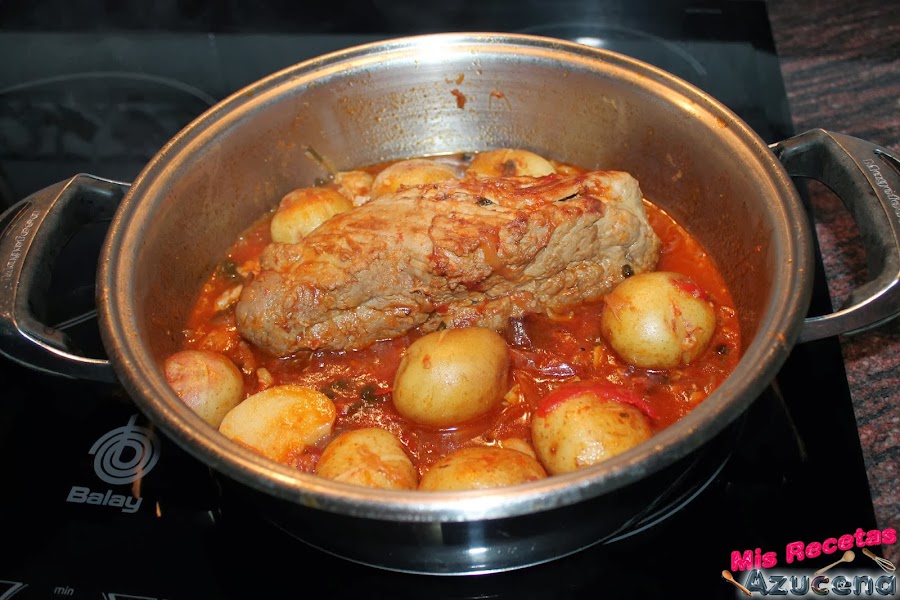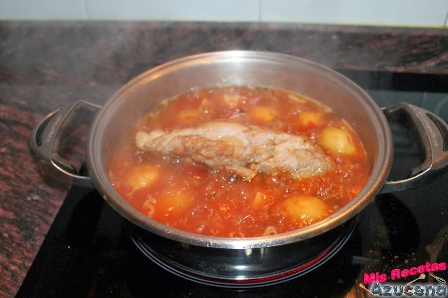 Pasados los 7 minutos añadiremos el caldo de carne y las patatas, taparemos la olla y dejaremos hasta que se reduzca casi todo el caldo y la carne, junto con las patatas estén tiernas.