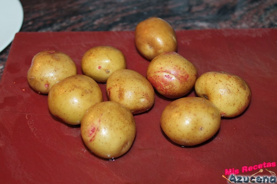 Mientras el vino reduce lavaremos bien las patatas ya que las dejaremos con la piel y le daremos un corte en el centro.
