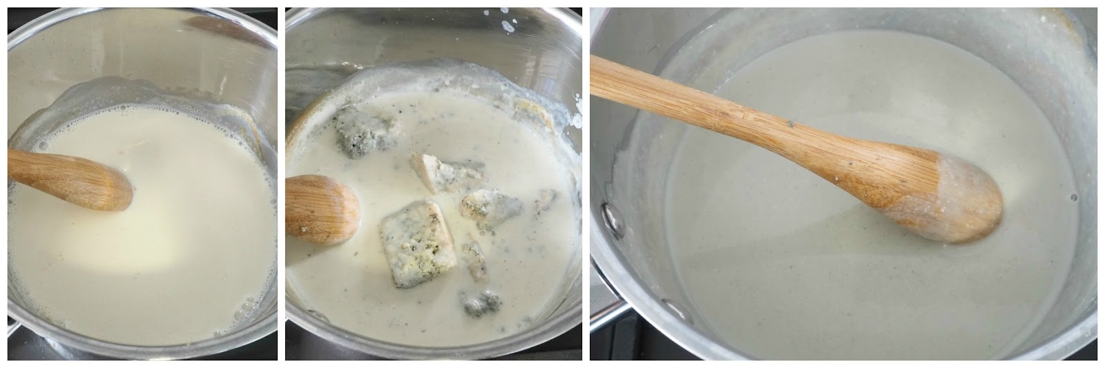 - En un cazo ponemos a calentar la leche ideal o la nata (crema de leche) (si usáis nata (crema de leche) a lo mejor queda una salsa muy espesa y necesitaréis añadir un poco de leche. Lo váis viendo). A continuación añadís el queso en trozos y removemos hasta que se deshaga del todo. Es imporetante que el fuego no esté muy fuerte para que no se pegue la mezcla al fondo del cazo. Y debemos remover contínuamente. En cualquier caso no tardará mucho. Cuando tengamos un salsa homogénea probamos y rectificamos de sal. Casi seguro que no nos hará falta añadir nada salvo que el queso que hayáis puesto no sea demasiado fuerte. En cualquier caso, probad mejor. El mío era bastante fuerte, como nos gusta y no hizo falta añadir nada.