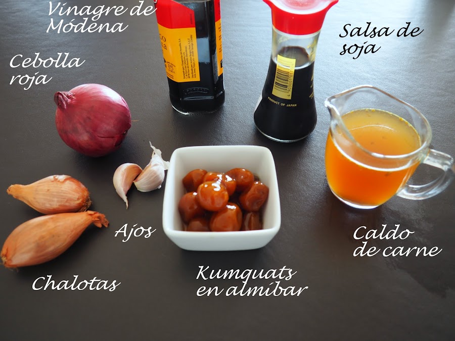 Incorporar unos cuantos kumquats junto a dos o tres cucharadas de su almíbar y dejar que se integre en la salsa. Añadir el caldo de carne caliente y dejar cocer y que vaya reduciendo.