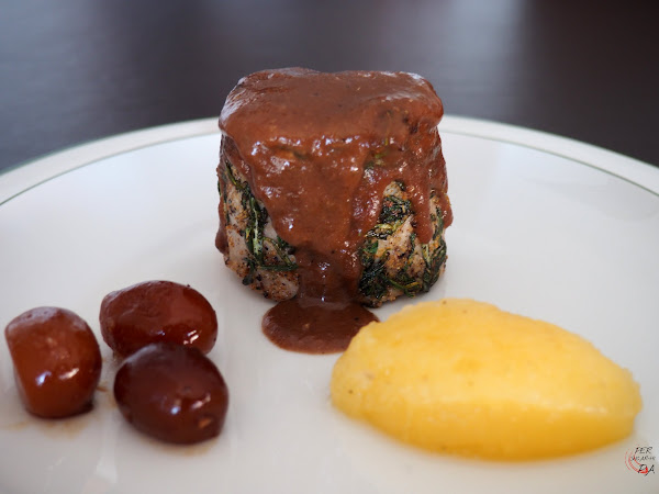 Para montar el plato colocar un medallón de solomillo, acompañarlo con una porción de puré de manzana y unos kumquats y glasearlo desde arriba con la salsa.