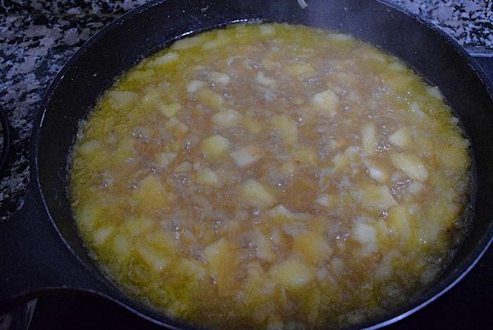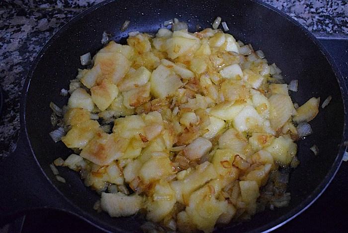 Picamos las chalotas, no hace falta trocearlas muy finas porque luego pasaremos la salsa . Pelamos también las manzanas y las cortamos en láminas.