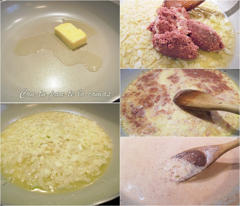 1. En una sartén calentamos el aceite y la mantequilla y pochamos la cebolla picada a fuego medio hasta que esté blandita y transparente.