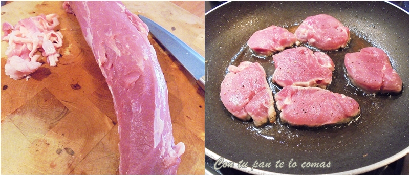 4. Limpiamos el solomillo de cerdo quitando la grasa y cortamos en filetes gorditos ( a tu gusto). Salpimentamos y freímos los trozos en una sartén con poco aceite a fuego vivo.