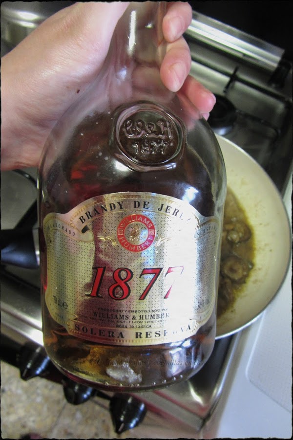 Agregar un chorrito de brandy y dejar que reduzca unos minutos para quitar el alcohol.