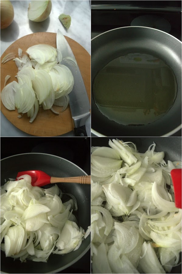 In a pan, heat 4 Tablespoon olive oil, and saute onion.