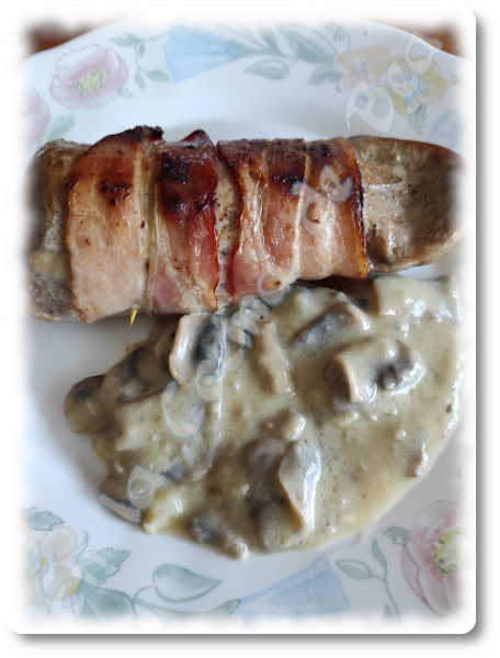 Solomillo: Cortamos cada solomillo en 4 trozos, sazonamos (poquito), los envolvemos con una loncha de bacon y sujetamos con unos palillos. Los doramos en una sartén con un poco de aceite.