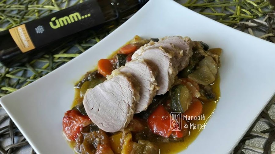 Ponemos en una fuente de horno las verduras , las regamos con el aceite de haber dorado los solomillos y encima colocamos éstos sellados.