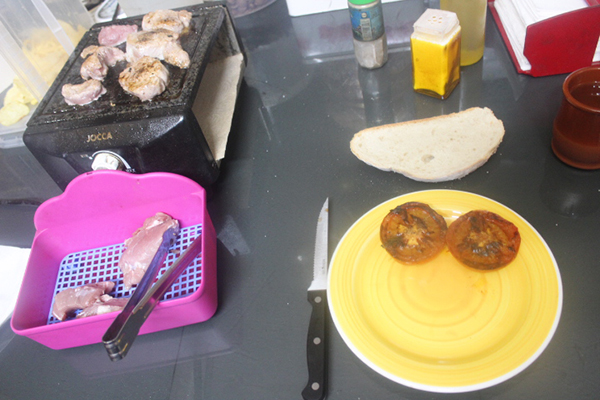 Comenzamos aceitando la piedra y colocamos los dos tomates abiertos por la mitad por la parte del corte, cuando comiencen a estar tiernos les damos la vuelta y especiamos al gusto.