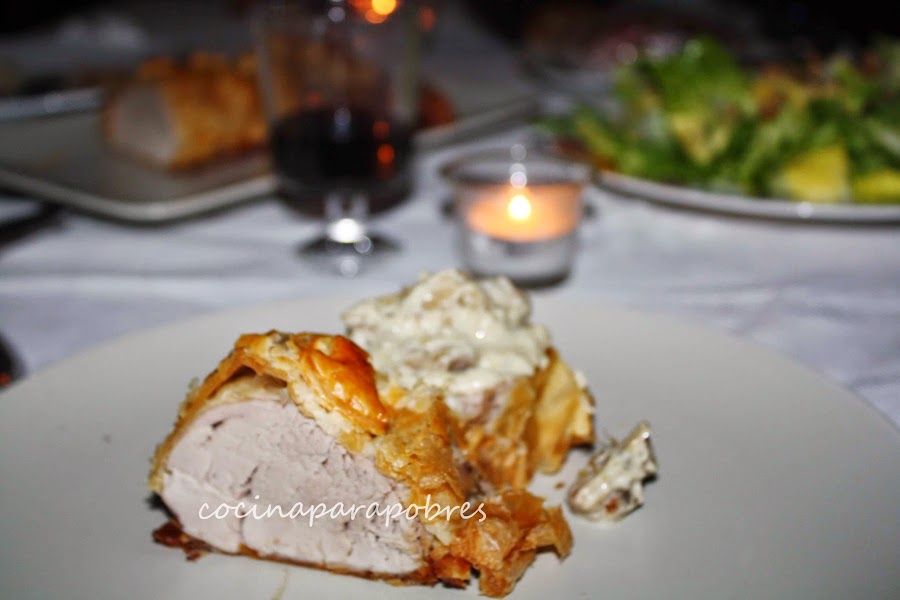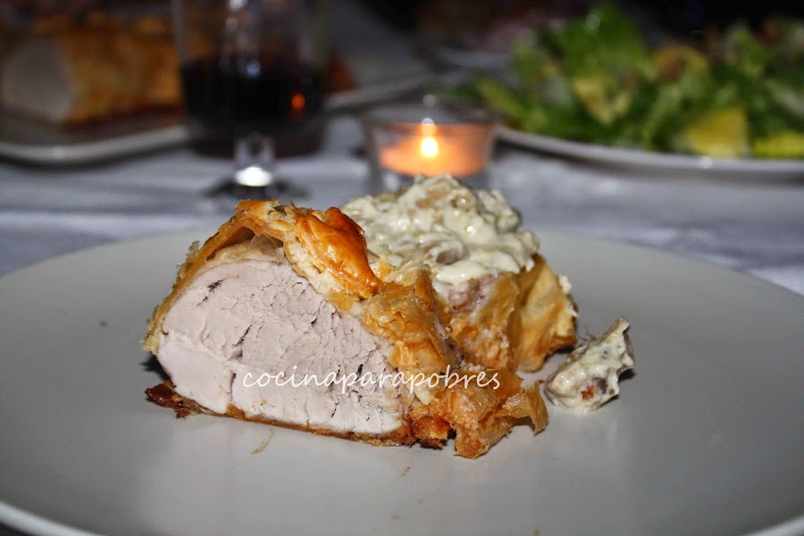 Con la ayuda de un rodillo estiramos la lámina de hojaldre, colocamos el solomillo en la mitad y envolvemos, podemos simplemente cubrirlo con la masa o si queremos quesea mas vistoso cortamos tiras y envolvemos en forma de trenza.