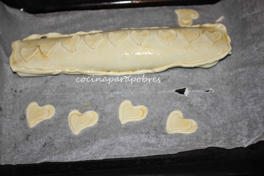 Pintamos con huevo batido y horneamos con el horno precalentado a 180.C aproximadamente 20 minutos, hasta que la superficie del hojaldre esté dorada.