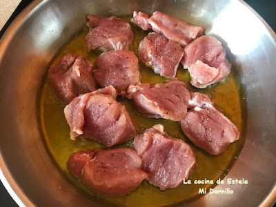 En una sarten amplia , marcamos las rodajas de solomillo salpimentadas en aceite de oliva. Sacarlas bien escurridas en una cacerola baja donde haremos todo.