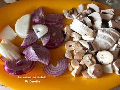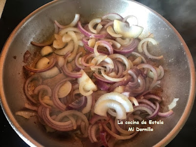 Cortamos las cebollas en rodajas y los ajo en pequeñito.