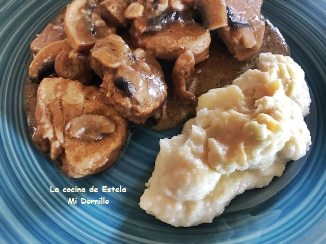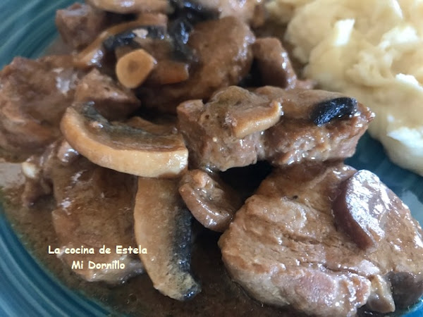 Cuando doren añade los champiñones en laminas, tapa y deja al mínimo unos minutos. Añade la harina y remueve muy bien, añadimos el vino y el brandy y subimos para que evapore el alcohol. Añadir la cucharadita de brovril con el agua o el caldo de carne en su caso. Deja que hierva unos minutitos y añádelo a las rodajas de solomillo, bajar el fuego y déjalo cocer todo junto unos 20 minutos hasta que evapore de salsa. Por ultimo le pones la leche evaporado, lo remueves bien.