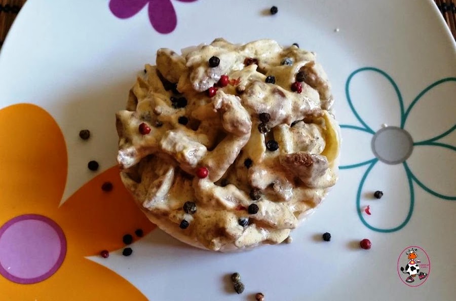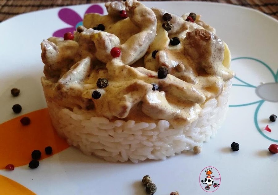 En un caldero al fuego ponemos un poquito de aceite de oliva y un diente de ajo laminado,cuando empiece a dorarse añadimos un vaso de arroz,3 vasos de agua y un poquito de sal,removemos y dejamos que se haga el arroz. En un caldero al fuego ponemos un chorrito de aceite, añadimos la cebolla en julianas y dejamos que se haga. En un almiré ponemos mas o menos una cucharadita de las 4 pimientas y machacamos y las añadimos a la cebolla. Cuando esté pochadita la cebolla añadimos el solomillo de cerdo en tiras y sofreímos. En un calderito aparte añadimos la nata (crema de leche), un poquito de sal y en un vasito ponemos un poquito de agua y añadimos una cucharadita de maizena,removemos bien y se lo añadimos a la salsa. Cuando la salsa empiece a espesar retiramos del fuego y se la añadimos al caldero donde tenemos el solomillo,mezclamos todo bien y dejamos a fuego lento unos 5 min. Yo para emplatar usé un molde redondo puse en el fondo el arroz y encima las tiras del solomillo con la salda de pimientas y para decorar puse unas pimientas.