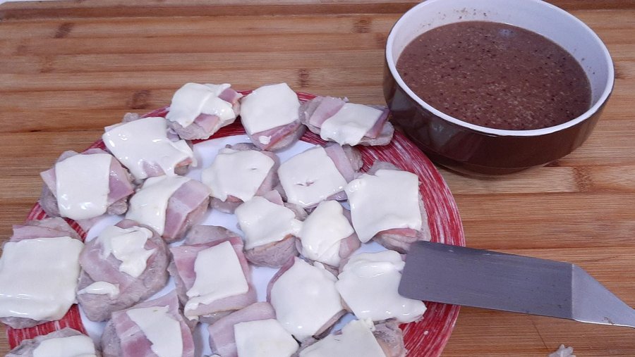4.- Cortamos el bacon y el queso en lonchas en cuartos. Reservamos