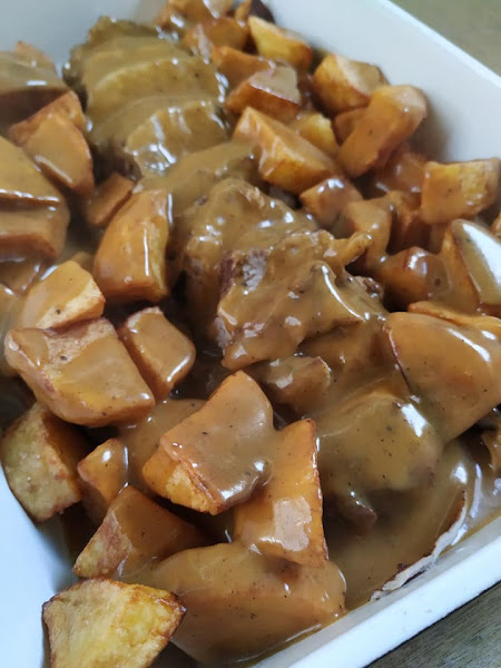 Mientras pelamos las patatas, las cortamos en dados y las freímos.