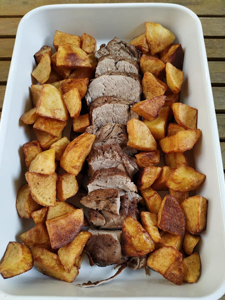 Preparamos una bandeja, ponemos el solomillo en medallones y las patatas, vertemos la salsa por encima.