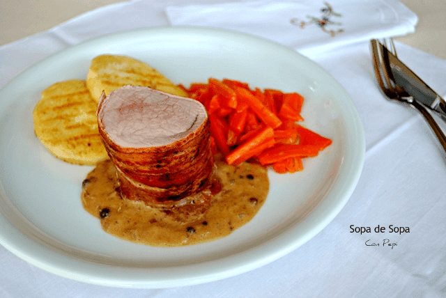Encender el horno a 150°C: Salpimentar el solomillo y envolverlo cada medallón con la panceta, hasta cubrirlo por completo. Sellarlo por todos los lados en una sartén con un poco de aceite y colocarlo en una fuente apta para horno. Meter la fuente en el horno ya caliente y dejar que se termine de hacer. Unos 15 minutos.