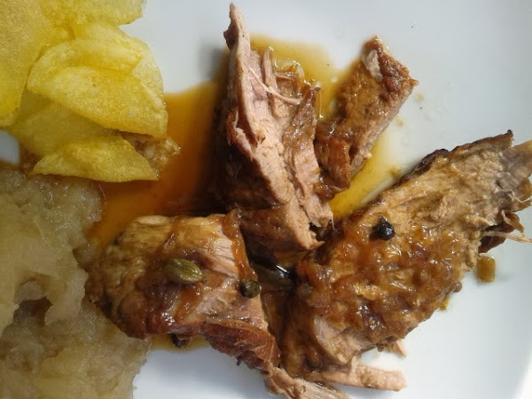 Se deja cocer lentamente hasta que la carne casi se deshilache (por lo menos 1h.30m.).
