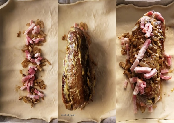 Extendemos la placa de hojaldre, le ponemos el pochado anterior y un poco de beicon en tacos o si lo tenemos en lonchas pues también. Untamos el solomillo con mostaza, también se puede untar con foiegrass, según el gusto, como a mis peques no les gusta, sólo pongo mostaza, ponemos un poco más de beicon y cerramos el hojaldre.