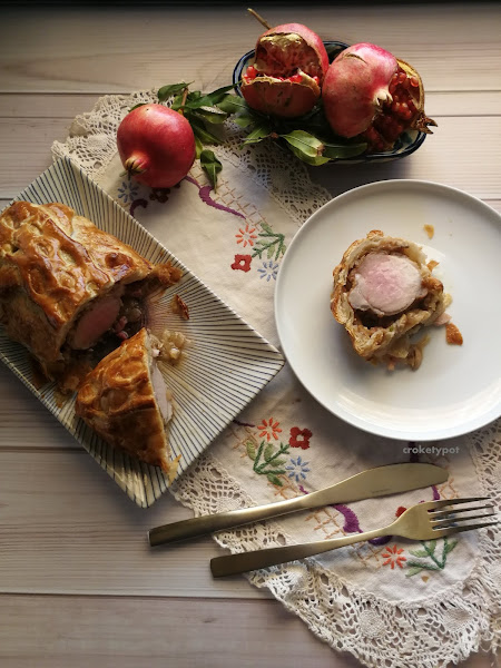 INGREDIENTES: 1 solomillo de cerdo, 1 placa de hojaldre fresco, 3 champiñones, 1/ 2 cebolla, beicon, 1 huevo, vino blanco Montilla, tomillo, mostaza, sal , pimienta aceite de oliva AOVE.