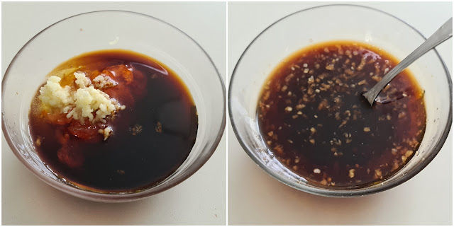 2. - Mientras se sella el solomillo, picamos el ajo, yo utilizo un triturador, y lo ponemos en un bol junto con el resto de ingredientes de la salsa, y lo mezclamos todo muy bien.