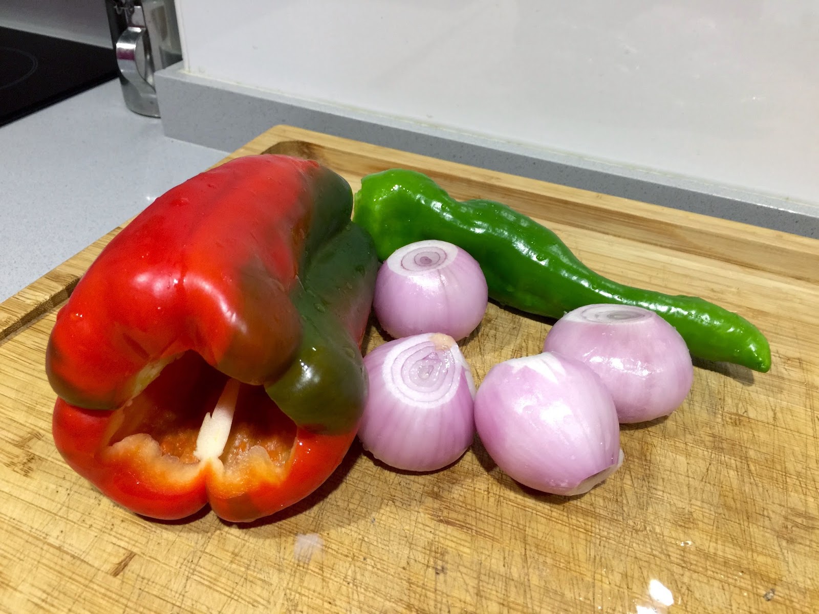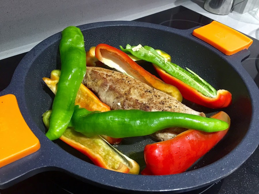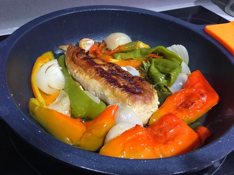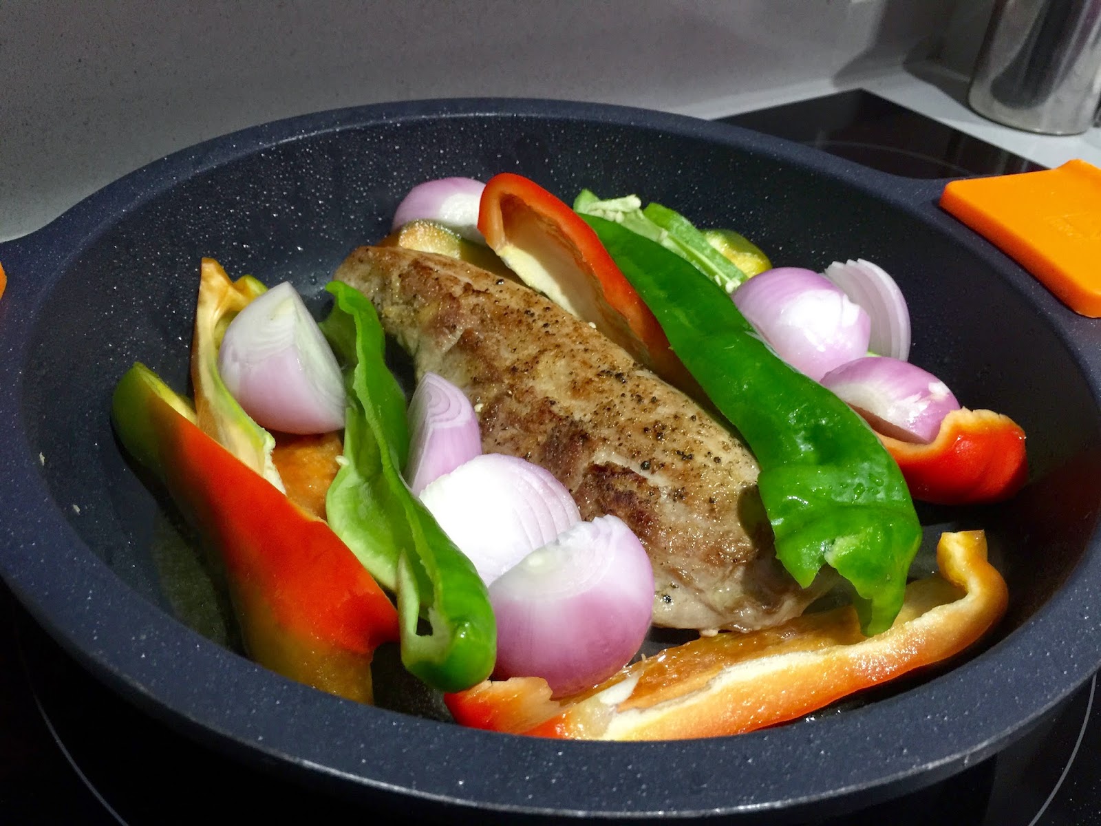 2. Lavamos los pimientos, los cortamos en tiras grandes y los ponemos en la olla. Pelamos las cebollas, las lavamos y las cortamos a cuartos. Cogemos los ajos con piel les hacemos un corte, para que no revienten. Ponemos todas las verduras con el solomillo a fuego bajo 3 o 4 de 10.