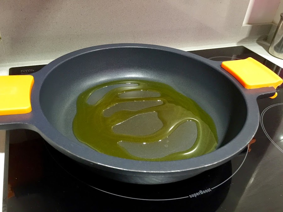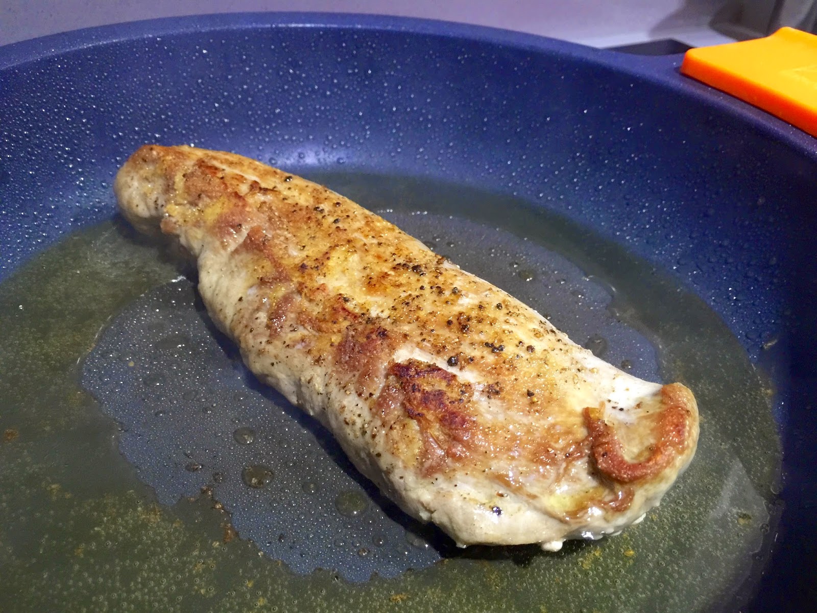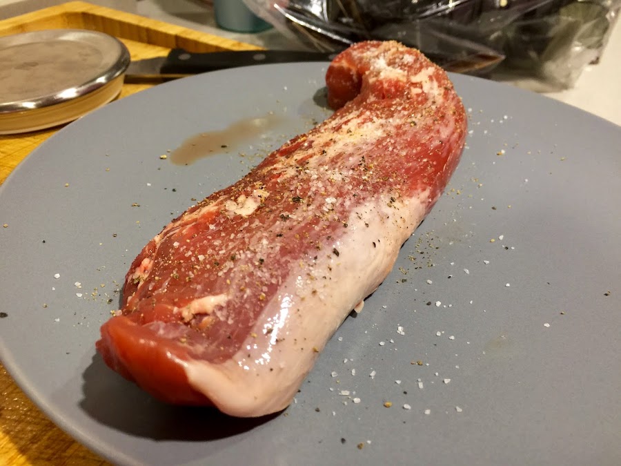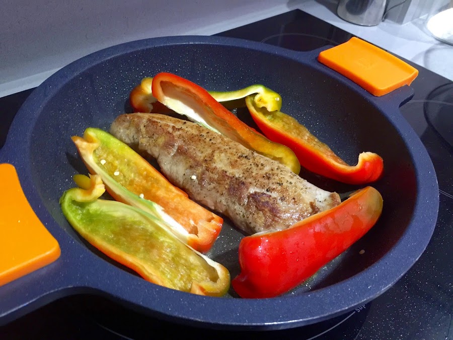 1. Lo primero que vamos a hacer es salpimentar el solomillo. Calentamos 4 cucharadas de aceite, ponemos el fuego al máximo y sellamos el solomillo. Lo marcamos bien por todos los lados, que nos quede doradito por fuera, pero crudo por dentro. Con esto conseguimos que durante la cocción no pierda los jugos, y así nos quede una carne jugosa y nada seca.