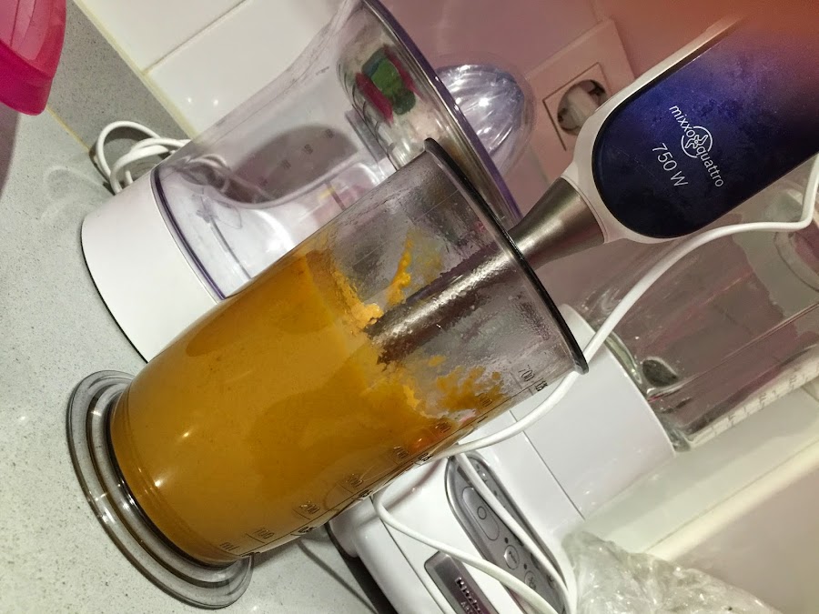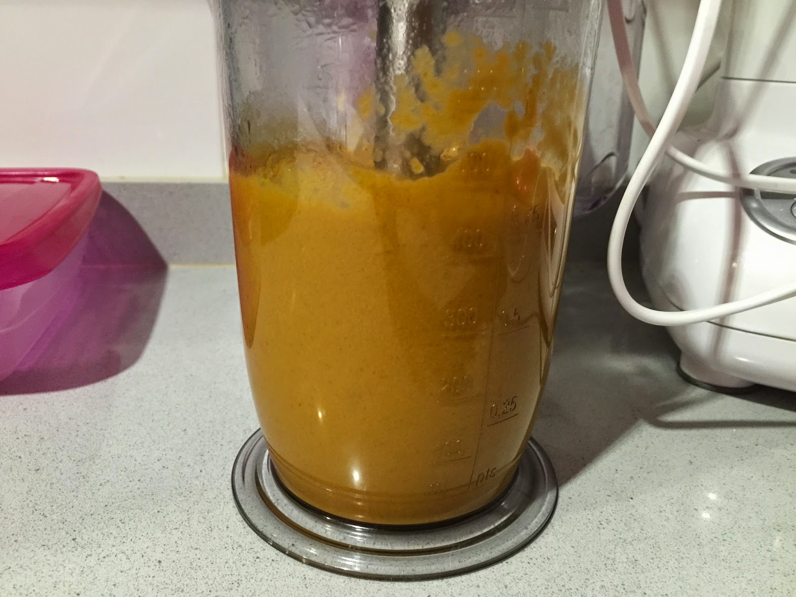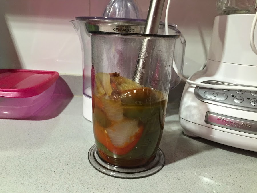 4. Pasados los 60 minutos, sacamos las verduras asadas, y el jugo del asado y lo trituramos con la túrmix. Cuando estén bien trituradas, añadimos la leche evaporada, si queremos una salsa mas ligera, o la nata (crema de leche) si nos gusta con una consistencia mas densa. Batimos bien con la salsa de las verduras.
