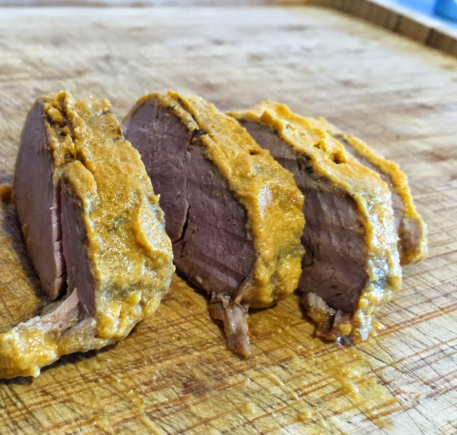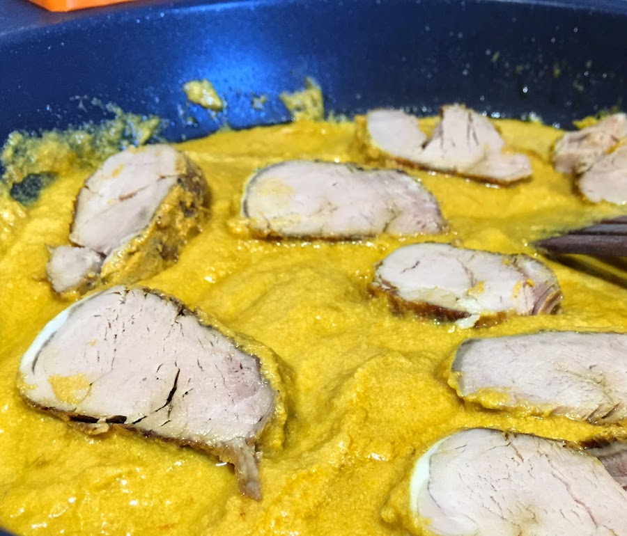 7. Cortamos el solomillo, un grosor de 1 cm aproximadamente. Calentamos junto con la salsa 10 minutos y listo para servir.