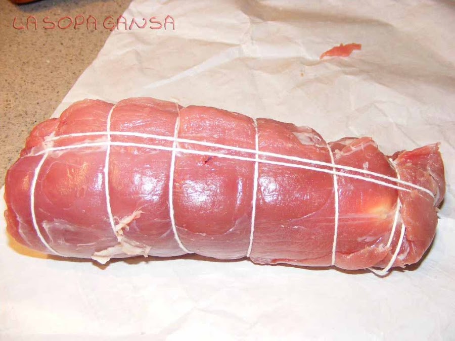 Con cuidado enrollamos el solomillo y lo atamos, replegando los bordes exteriores hacia dentro para que no se nos salga el relleno