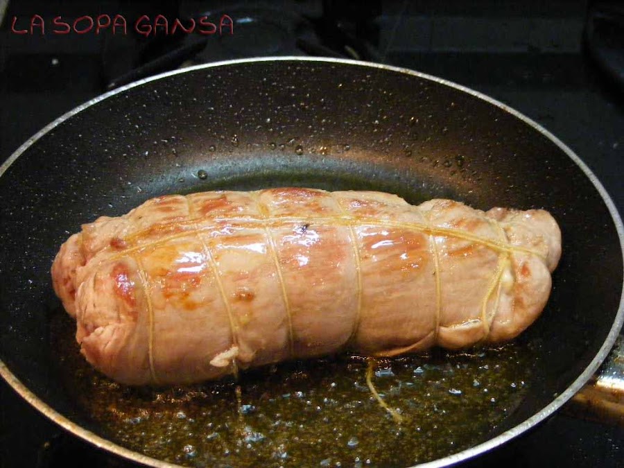 En una sartén con un poco de aceite de oliva, doramos el solomillo a fuego medio, sólo hasta que adquiera un tono dorado, no demasiado tiempo o se quedará seco. hay que tener en cuenta que luego se terminará de cocinar en el horno.