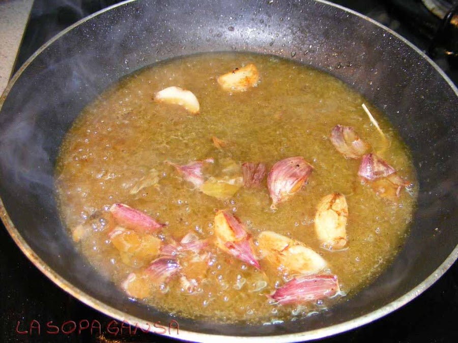 Sacamos el solomillo y lo depositamos en una fuente de horno, y ahora pasamos a hacer la salsa: en ese mismo aceite doramos los ajos enteros con su piel. A los ajos les damos antes un golpe con el cuchillo para abrirlos un poco, así desprenderán mayor sabor y evitaremos que salte el aceite. Cuando estén los ajos dorados a nuestro gusto, añadimos a continuación un vaso de caldo de carne y por último, agregamos una copa de jerez y dejamos reducir un poco, no más de un minuto