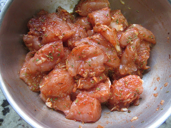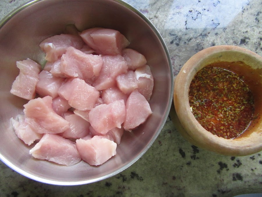 1- Cortar los solomillos de pavo en dados y hacer de este adobo, majar el ajo y mezclar con la sal, la pimentón, el orégano y el agua. Macerar una o dos horas, o durante la noche.