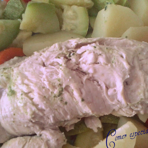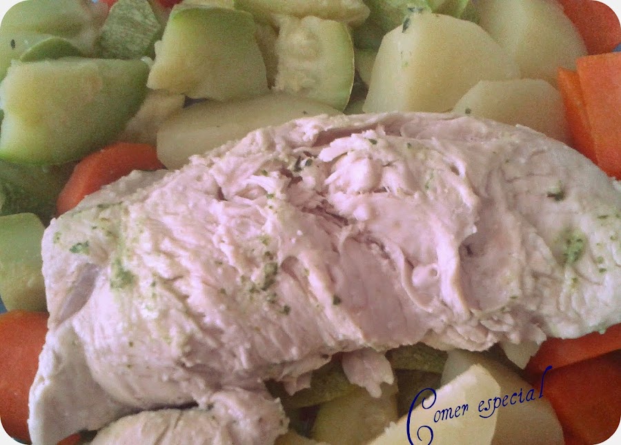 INGREDIENTES (2 comensales): Solomillo de pavo de unos 250-350 gramos, 2 papas hermosas toscamente cortadas, 1 calabacín y 2 zanahorias igualmente troceados, 3 dientes de ajo, perejil, sal, agua, aceite, vinagre.