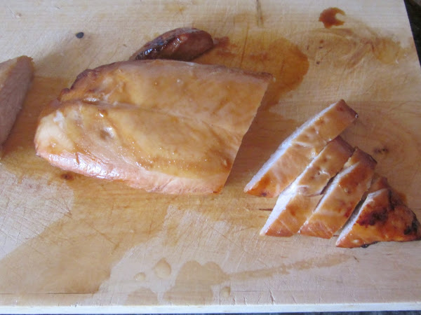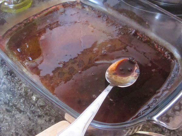 Pasado el tiempo sacamos los solomillos a una tabla, y cortamos en rodajas, la salsa que queda en la fuente del horno,la usamos para regar la carne, sale espesa por la miel.