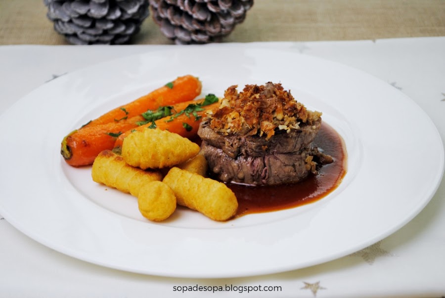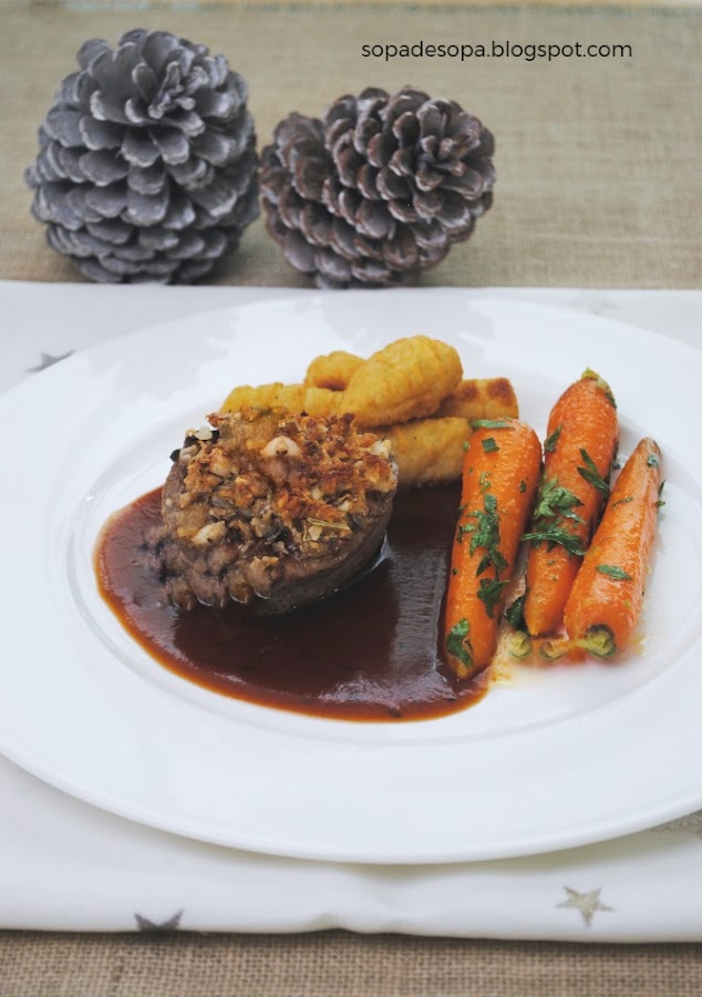La costra o capa para cubrir este medallón de carne es a base de macadamia y especias "Lebkuchen", muy típicas aquí en Alemania por estas fechas. La salsa está hecha de vino Oporto que conjuntado con el acompañamiento hace que sea un plato exquisito.
